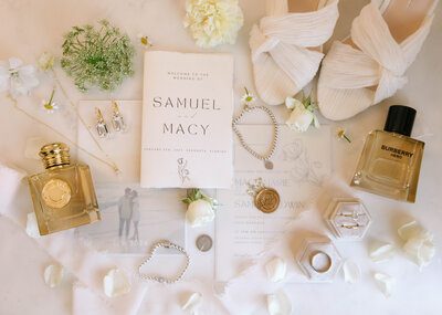 Your wedding flat lay photos showcase those details so you always remember every last part of your wedding – from the sentimental heirlooms to the perfume you wore. Flatlays are done in the beginning of the day, while you are getting ready! I bring stuff for it too (ring boxes, ribbon, trays)